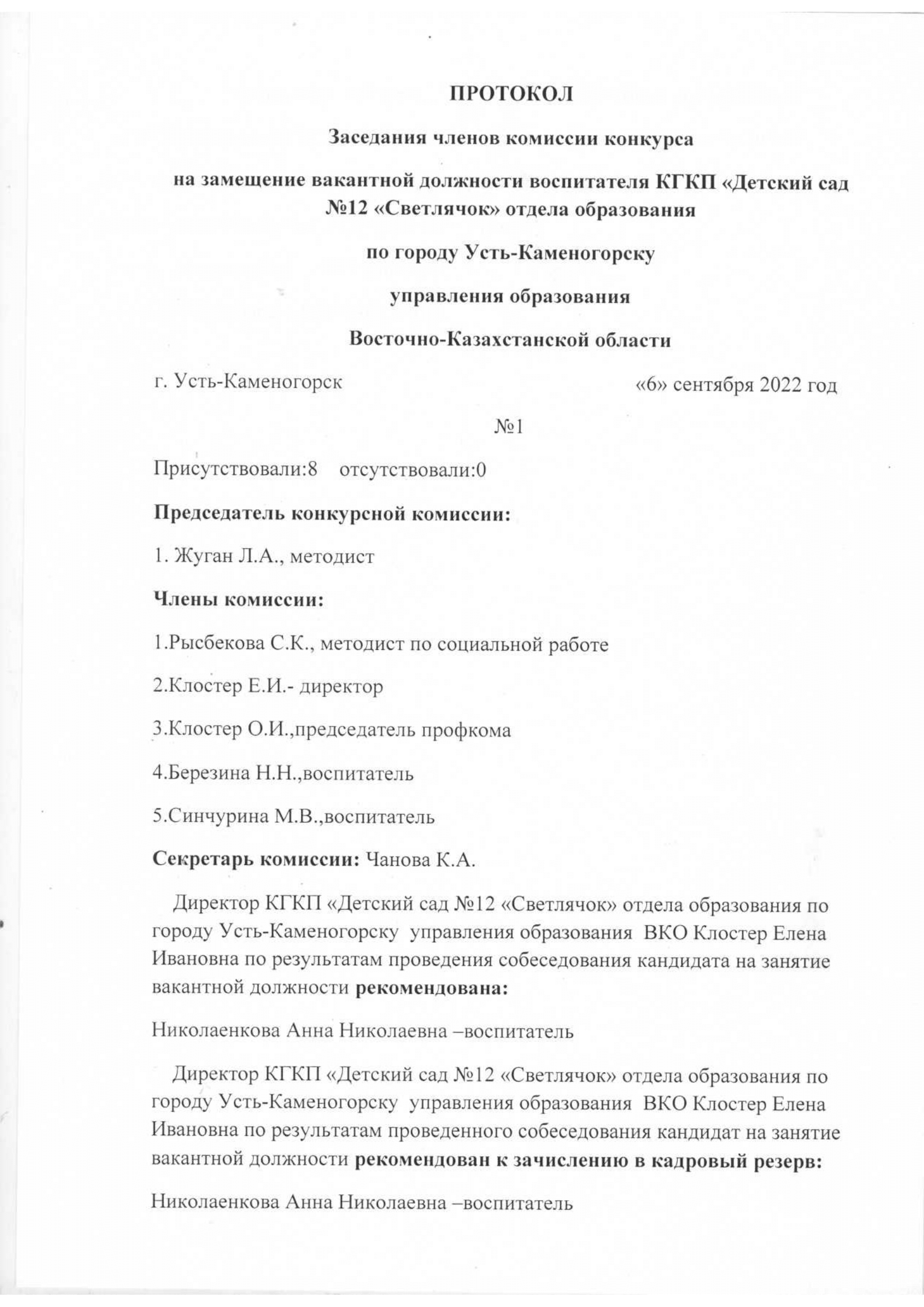 Проведение конкурса на занятие вакантной должности воспитателя государственной организации образовании